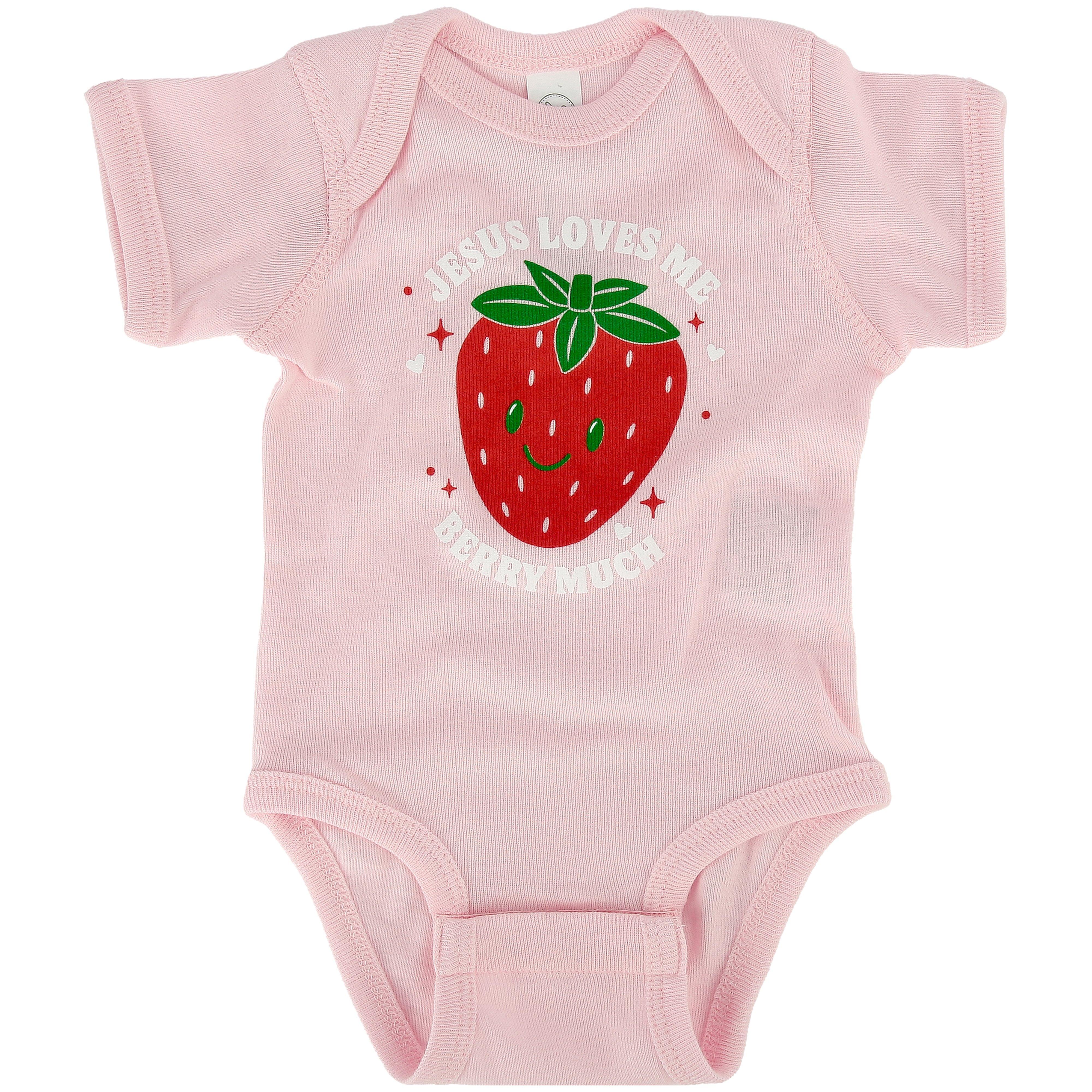 Jesus Loves Me Berry Much Strawberry Pink Baby Onesie, by New Ewe, NB-12M