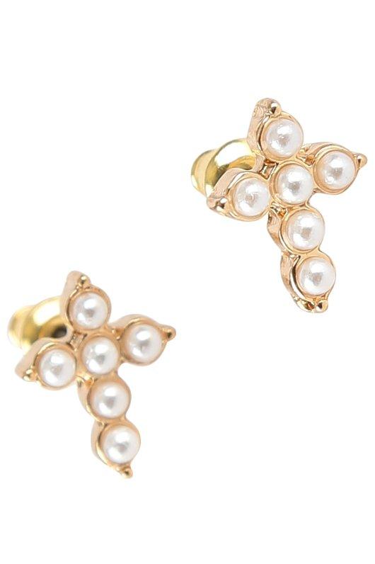 Bella Grace, Tiny Cross with Pearls Stud Earrrings, Gold, Zinc Alloy